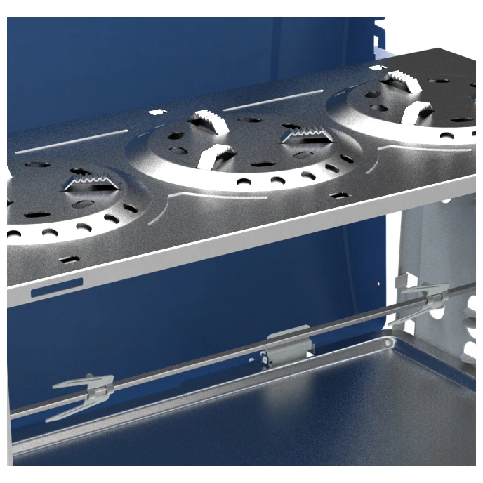 Die drei Flammen oben dienen als Herdplatten, während man darunter ein Hähnchen am Spieß oder Würstchen auf dem Grillrost grillen kann. Details wie der robuste Griff für den Transport, der mitgelieferte Drehspieß und das spülmaschinenfeste Fettauffangtablett machen den Grill komplett.