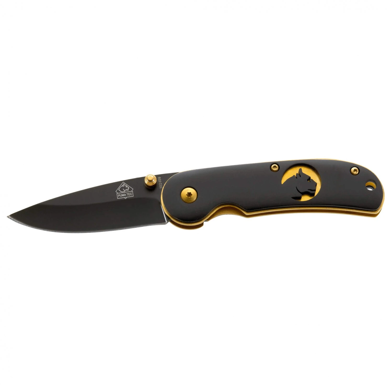 Scharf, praktisch und edel im Design: das Puma-Tec-Einhandmesser Gold Platinen 6,3 cm! Die Griffschalen aus schwarzem Aluminium sind durch goldfarbene Platinen optisch veredelt und liegen sicher in der Hand. Ein Lasercut des charakteristischen Puma Firmenlogos setzt das i-Tüpfelchen. Die Klinge aus rostfreiem AISI 420 Stahl ermöglicht ein präzises Arbeiten und kann mit den ebenfalls goldfarbenen, beidseitig verarbeiteten Daumenpins geöffnet werden.