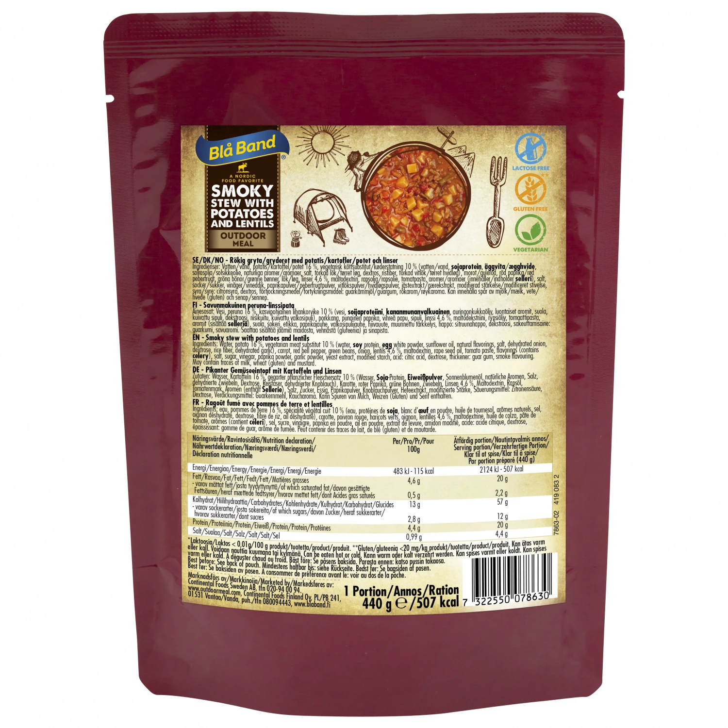 Eine kraftspendende Mahlzeit für unterwegs: der Linseneintopf mit Kartoffeln von Blå Band. Besonders praktisch: Für die Zubereitung der Mahlzeit wird kein zusätzliches (Trink-) Wasser benötigt. Es lässt sich entweder kalt genießen oder mitsamt des Beutels im Wasserbad erhitzen und direkt aus dem Beutel essen. Das spart unterwegs sowohl Trinkwasser als auch Geschirr. Die herzhafte Kombination aus Linsen und Kartoffeln schmeckt deftig lecker und liefert unterwegs wieder Kraft für die nächsten Kilometer.