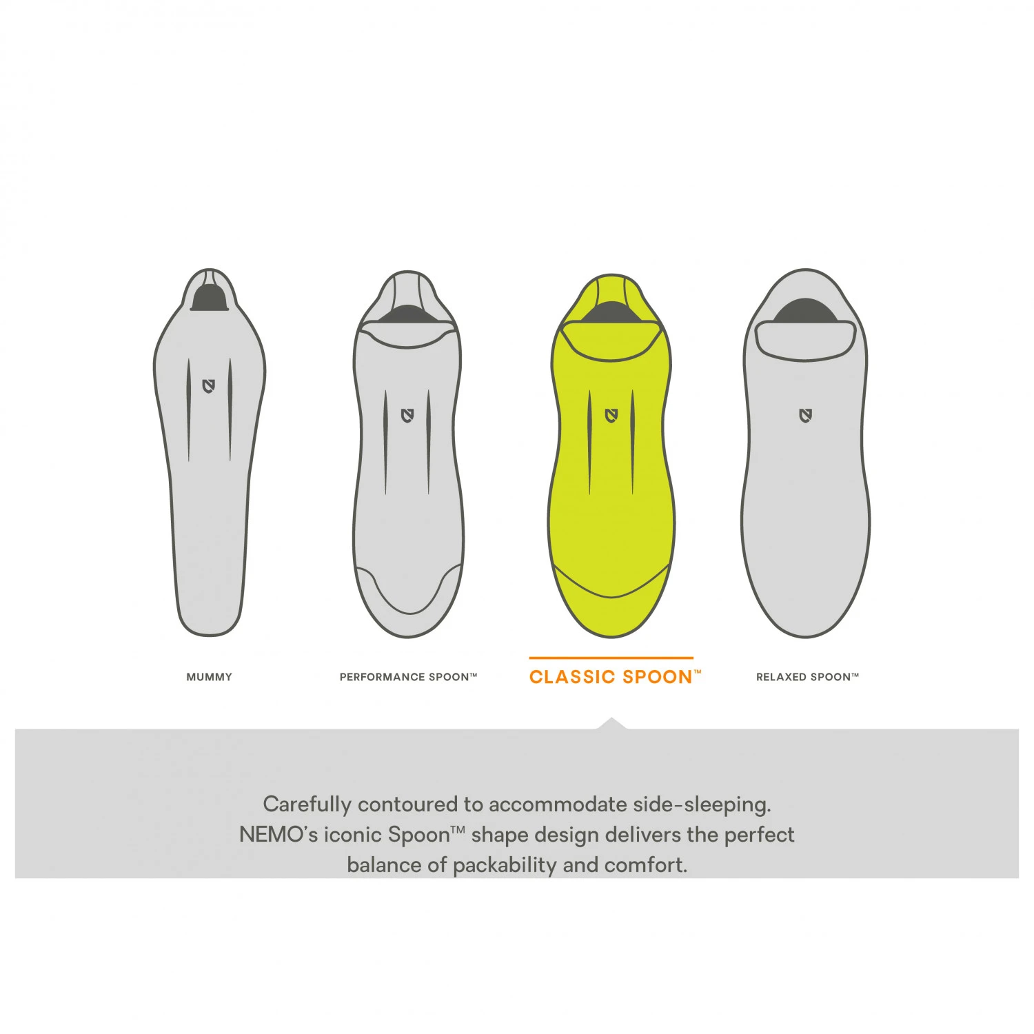 Bei Temperaturen bis etwa 2° C bietet der Forte Mens 35 Kunstfaserschlafsack von Nemo angenehme Wärme beim Camping, Trekking und Radreisen mit Zelt. Mit seinem komfortablen Spoon Shape Design ist der Schlafsack dabei besonders bewegungsfreundlich und bietet vor allem Schultern und Becken genügend Raum. Für die hervorragende Wärmeleistung im Nemo Schlafsack ist die synthetische FeatherCore Füllung verantwortlich, die vergleichbar mit einer Daunenfüllung mit 650 cuin Bauschkraft ist. Der Forte Mens 35 wiegt nur 1250 g und lässt sich für den Transport im Trekkingrucksack auf 29 x 23 cm komprimieren. Ein passender Packsack und ein extra Aufbewahrungsbeutel aus Mesh-Gewebe ist im Lieferumfang bereits enthalten. Die warme Kapuze und praktische Ventilationsöffnungen auf der Vorderseite komplettieren den funktionellen Rucksack für Backpacker.