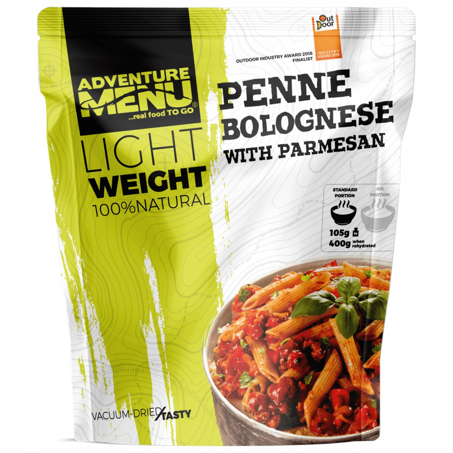 Wer kennt und liebt sie nicht: die klassische Penne Bolognese! Das Nudelgericht von Adventure Menu besteht aus einer herzhaften Sauce aus Rinder- und Schweinehackfleisch, Karotten, Sellerie und Tomaten und wird durch Rotwein abgerundet. Logisch, dass Parmesan auch mit dabei ist! Das Gericht ist gefriergetrocknet, super lange haltbar und wird einfach mit Wasser aufgegossen. Guten Appetit!