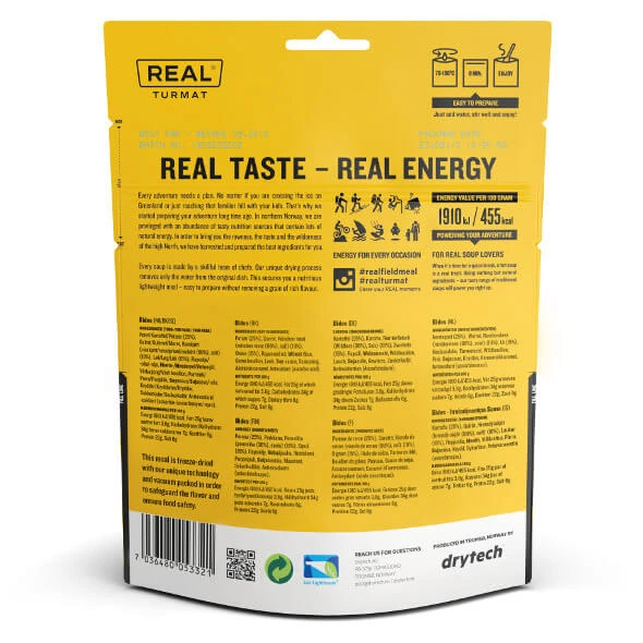 Für alle, die auf Tour eine deftige Suppe bevorzugen, denen sei die Bidos Soup von Real Turmat ans Herz gelegt. Mit arktischem Rentier, Kartoffeln und Karotten. Zutaten: Kartoffel (25%), Karotte, Rentierfleisch (Rentierfleisch (98%), Salz) (18%), Zwiebeln (15%), Rapsöl, Weizenmehl, Wildbouillon, Lauch, Sojasoße, Gewürze, Zuckerkulör, Antioxidantien (Ascorbinsäure).Den Packungsinhalt mit 320 ml heißem Wasser aufgießen. Umrühren, Zipper schließen, dann 8 min warten.