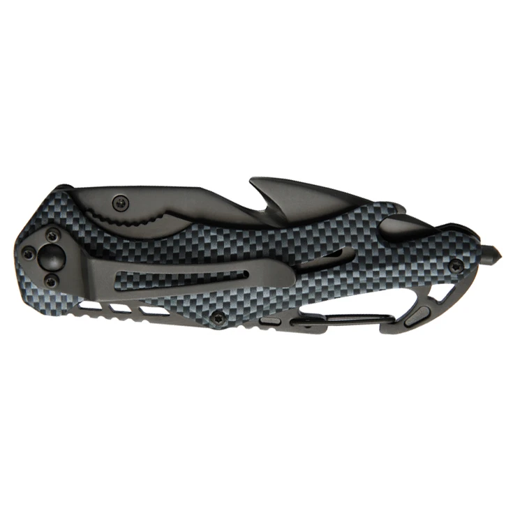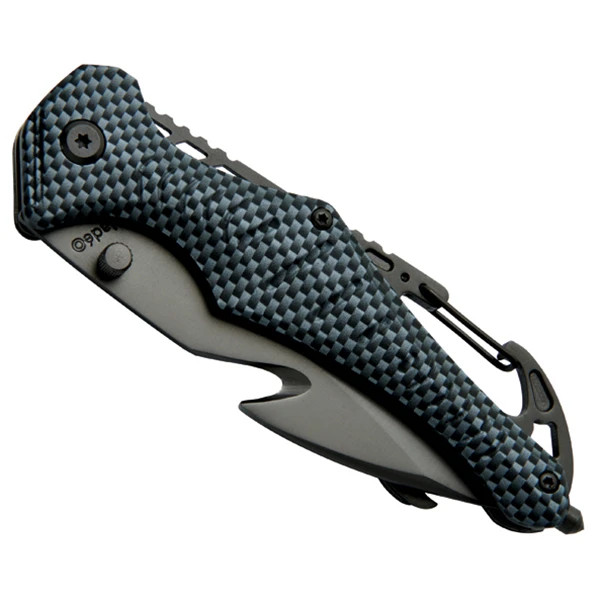 Das Rettungsmesser Emergency von Baladéo hat eine halbseitig gezahnte Klinge aus Edelstahl mit Titanbeschichtung. Für Notsituationen bietet dieses Messer drei Funktionen: einen Gurtschneider, einen Seilschneider und einen Scheibenzertrümmerer. Außerdem ist das Messer mit einem Flaschenöffner ausgestattet. Durch die Sicherheitssperre Liner Lock lässt sich das Messer mit einer Hand öffnen und schließen. Eine Gürtelschnalle und ein integrierter Karabinerhaken sind ebenfalls am Messer vorhanden.