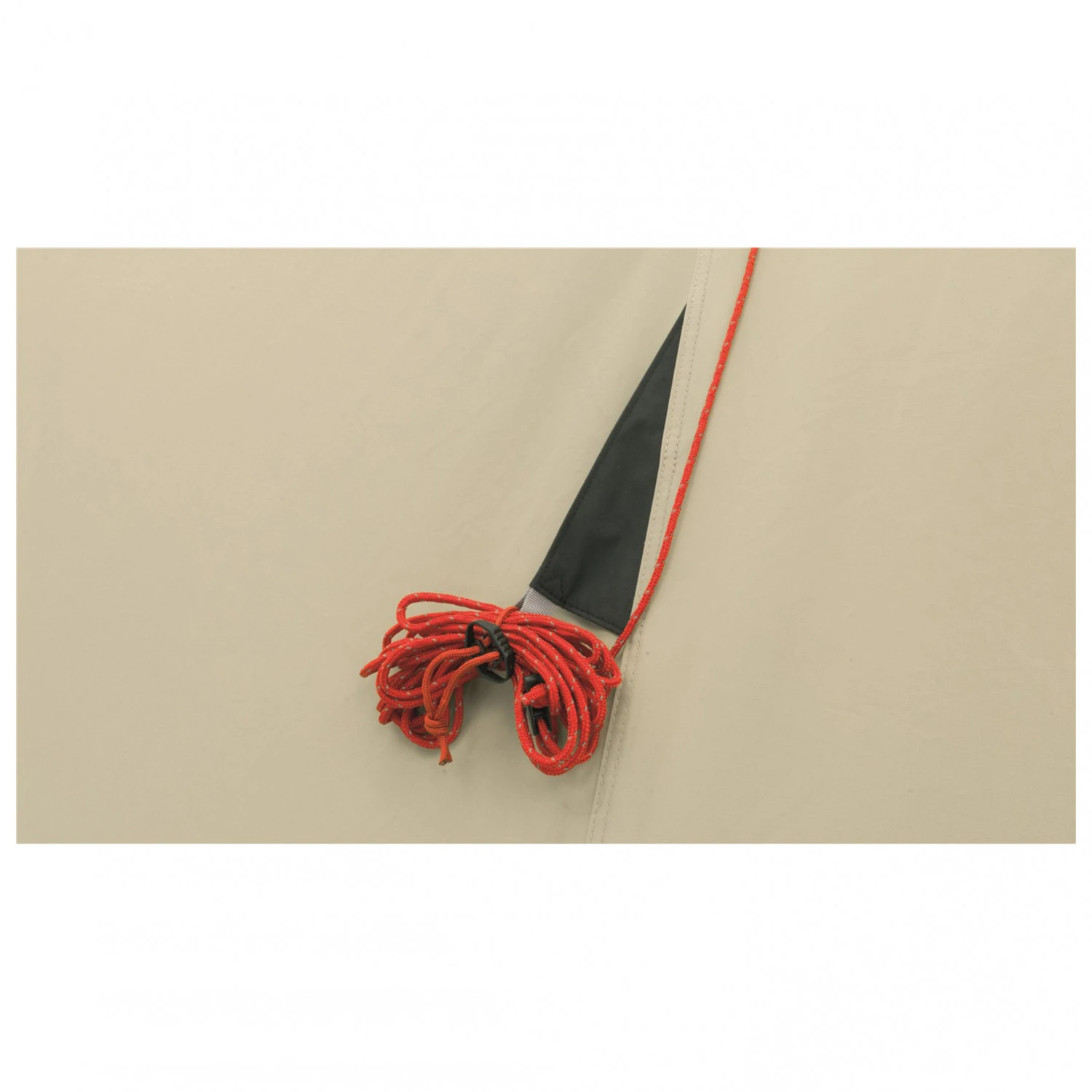 Der große Wohn- und Schlafbereich bietet angenehm viel Platz für bis zu acht Personen und dank Pyramiden-Konstruktion eine zum Zentrum hin ordentlich zunehmende Stehhöhe. Der Frontbereich wird über einen A-förmigen Rahmen verstärkt und kann sowohl als Zelteinstieg mit Mesh-Insektenschutztür als auch als komplett geöffneter Vorbau verwendet werden. So wird das Zelt zum offenen Outdoor-Wohnzimmer mit sonnenschützender Markise. Der Zeltboden ist mit einer Wassersäule von starken 10.000 mm und hält jegliche Bodenfeuchtigkeit effektiv draußen. Bei Bedarf kann der Boden über den zur Mittelstange verlaufenden Reißverschluss geöffnet und zu den Seiten ein Stück weit aufgerollt werden. So entsteht eine bodenlose Fläche zum sicheren Kochen oder als Nassbereich. Für den Transport zum Campingspot oder zur Lagerung im Equipmentkeller kommt das Chinook Ursa platzsparend in den mitgelieferten Packsack. Tip top!
