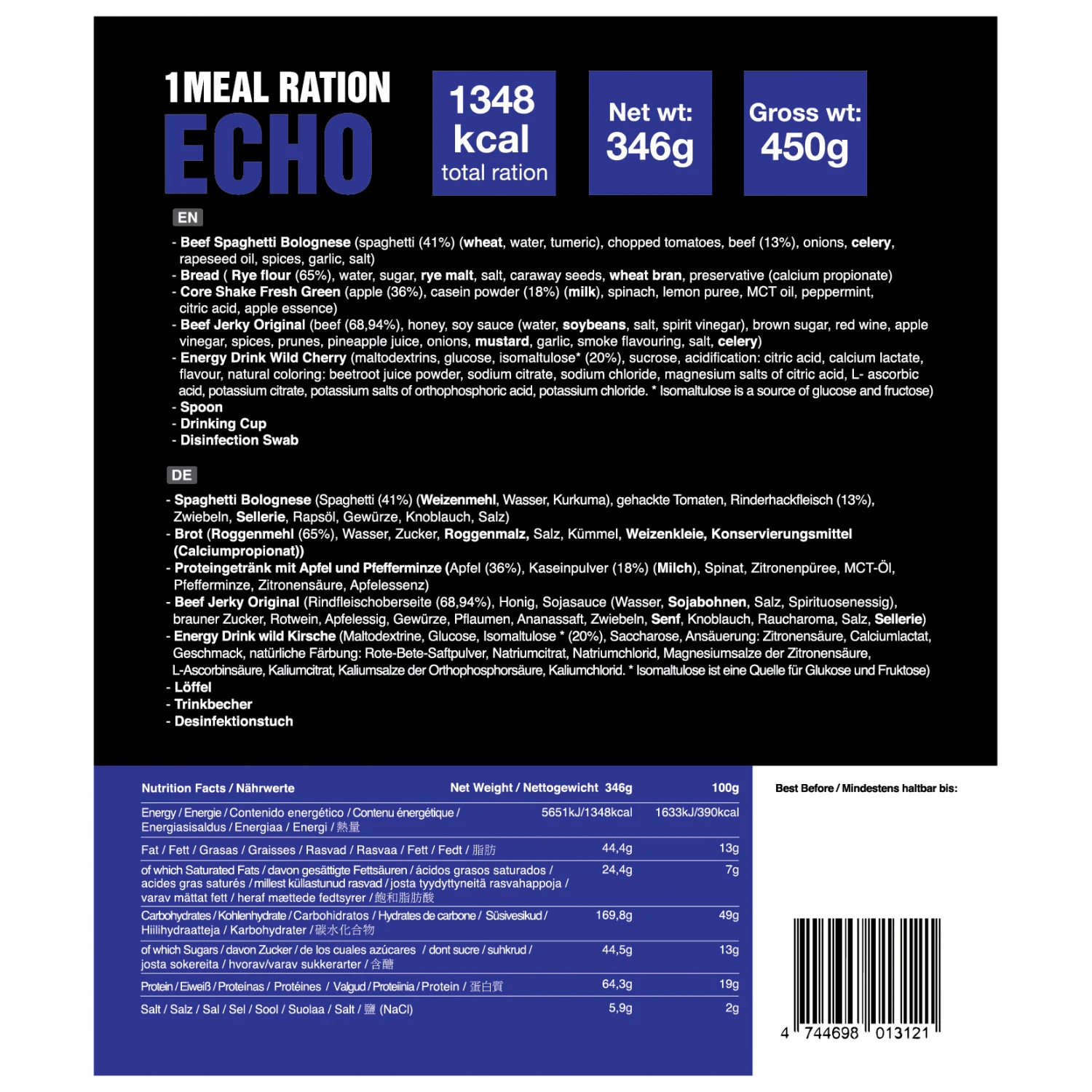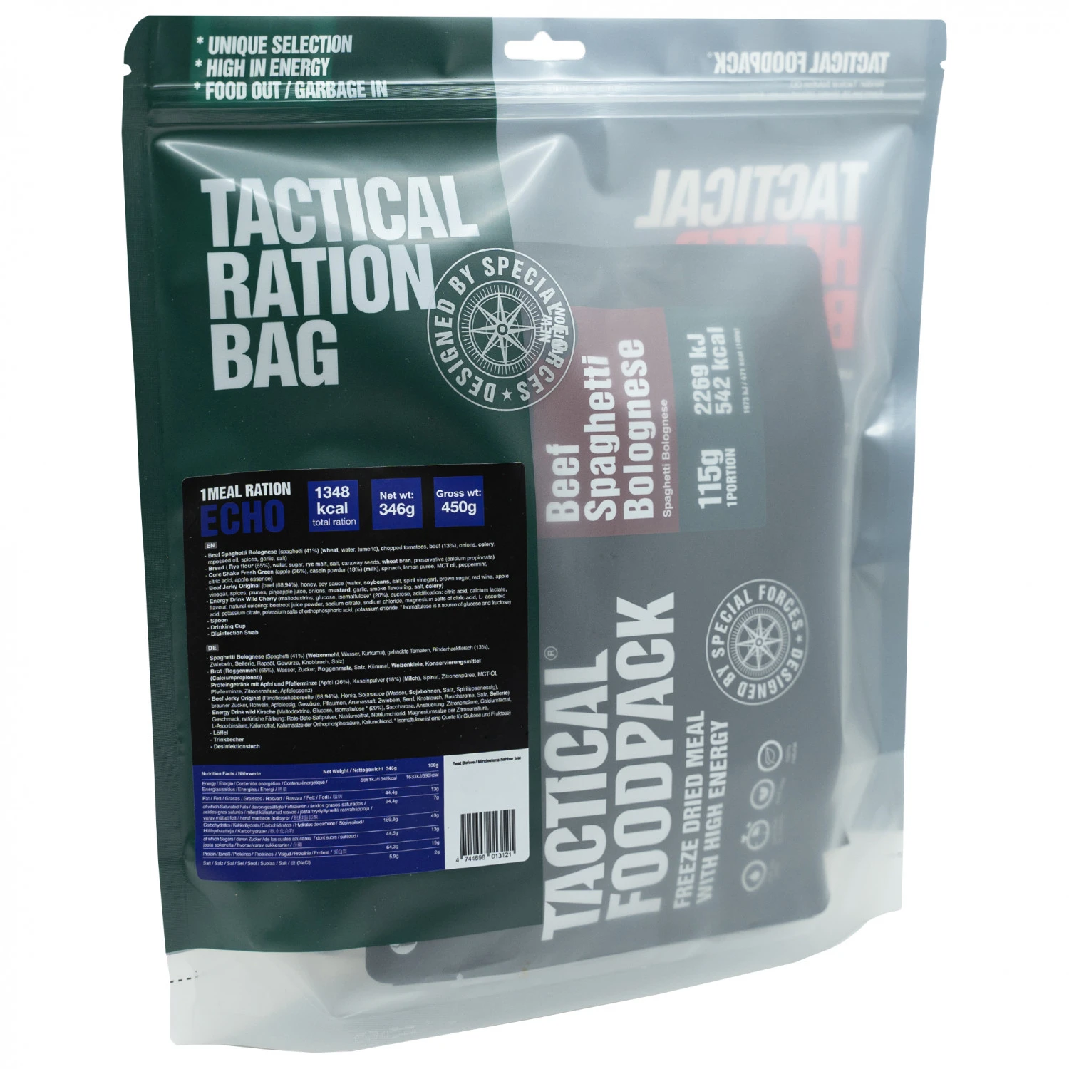 Der TACTICAL FOODPACK Ration Echo enthält eine Hauptmahlzeit, verschiedene Snacks und ein Getränk.